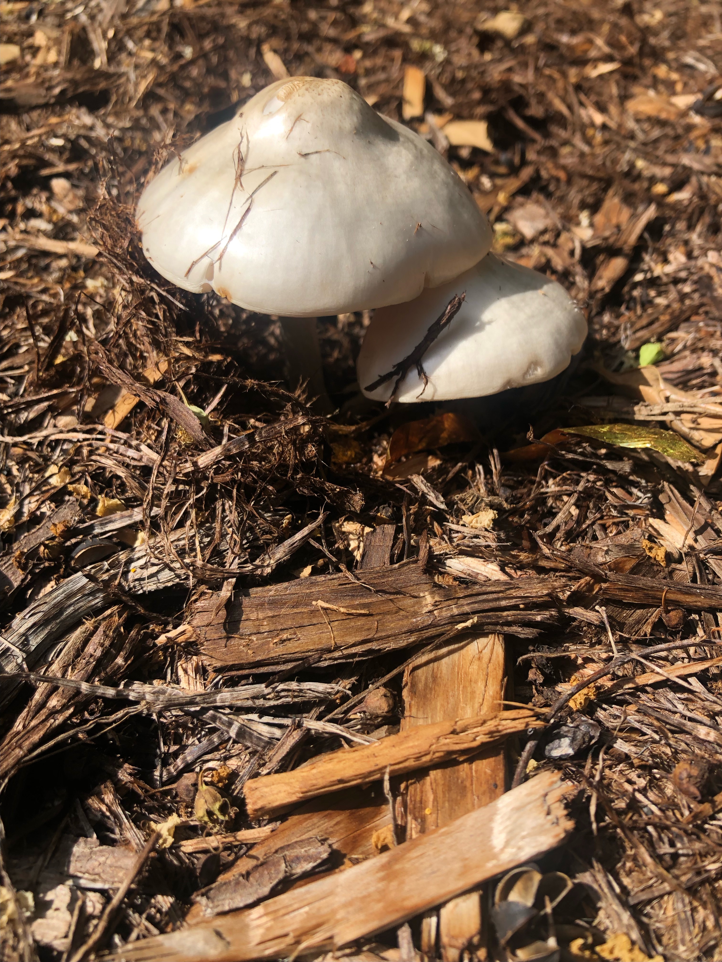 Recently, as I was leaving work, I noticed in the building’s flower bed something unusual: pale mushrooms had sprouted amongst the woodchips. It was odd, since the landscapers are routinely working day-by-day to keep the university’s gardens and walkways as beautiful as can be. I consider mushrooms amazing and wondrous to look at, so I decided to take a quick picture despite the triple-digit heat that was making me want to run for my car and head home. So I squat, took my phone, and snapped a photo, the one below.