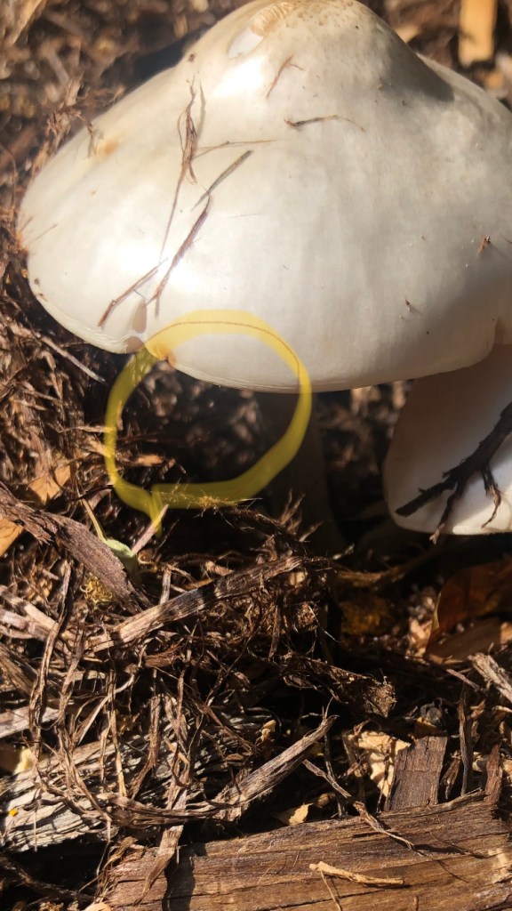 I finally got home later into the sanctuary of my air conditioning. I kicked my heels off and decided to check the photographs. It was still surprising to have found such sneaky fungi. Then I noticed the blurry haze beneath the bigger shroom cap, and thought, “god, this phone camera is crap.” But I noticed something. Do you? Take a look below at where I’ve circled.